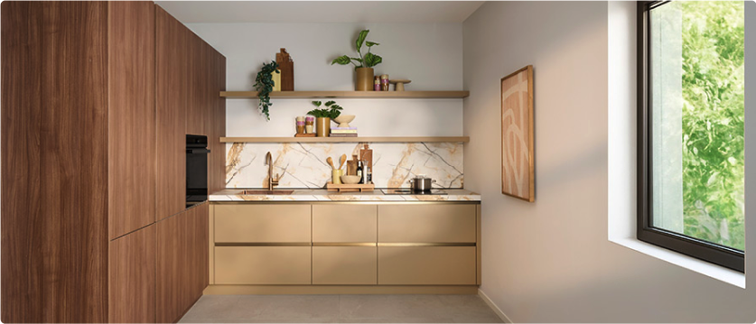 Keukentip: Een kleine keuken heeft afmetingen van 2,5 bij 2,5 meter of minder. Houd daar in je keukenontwerp rekening mee door open kastjes te gebruiken. Dat oogt ruimtelijker.